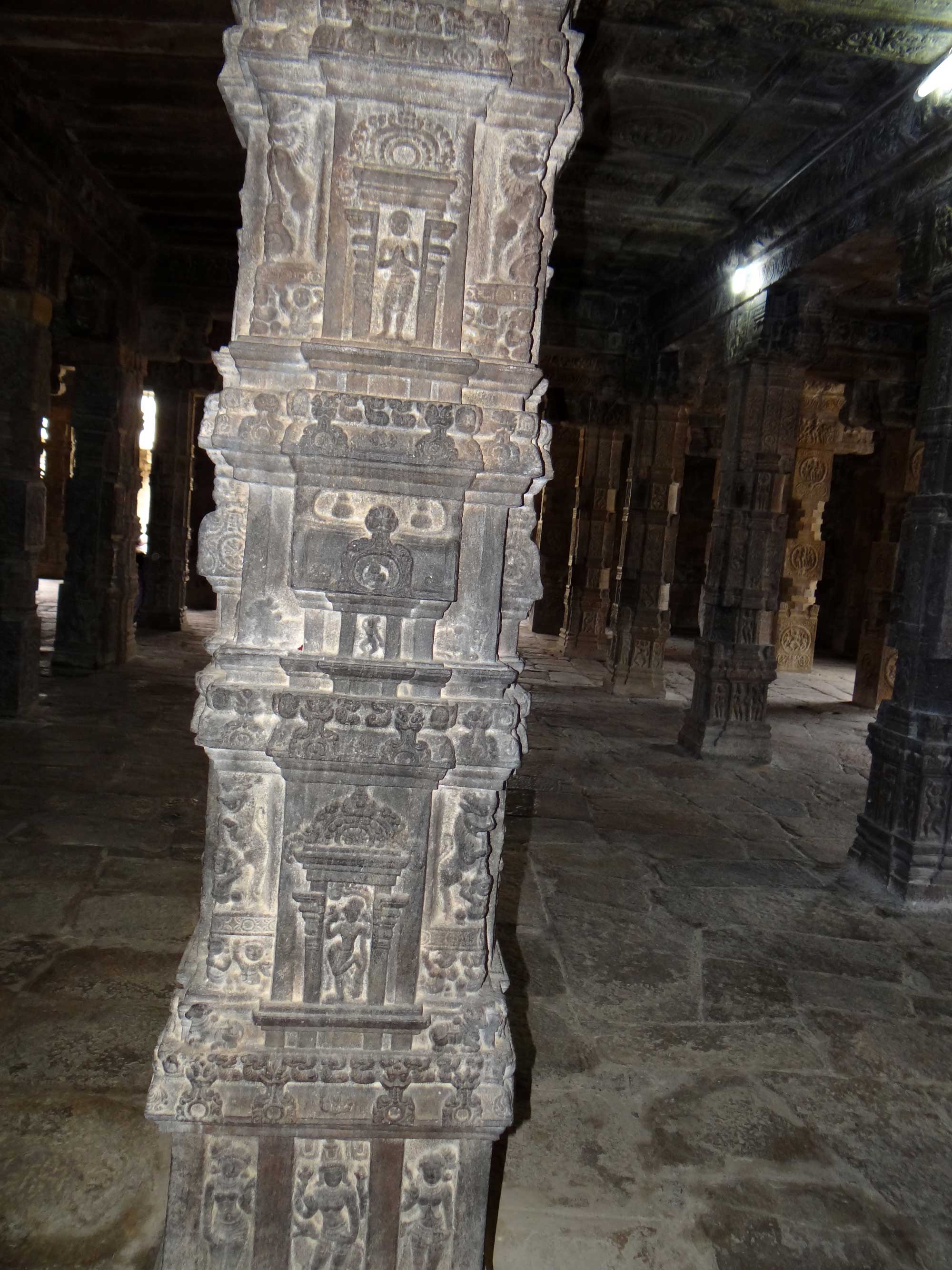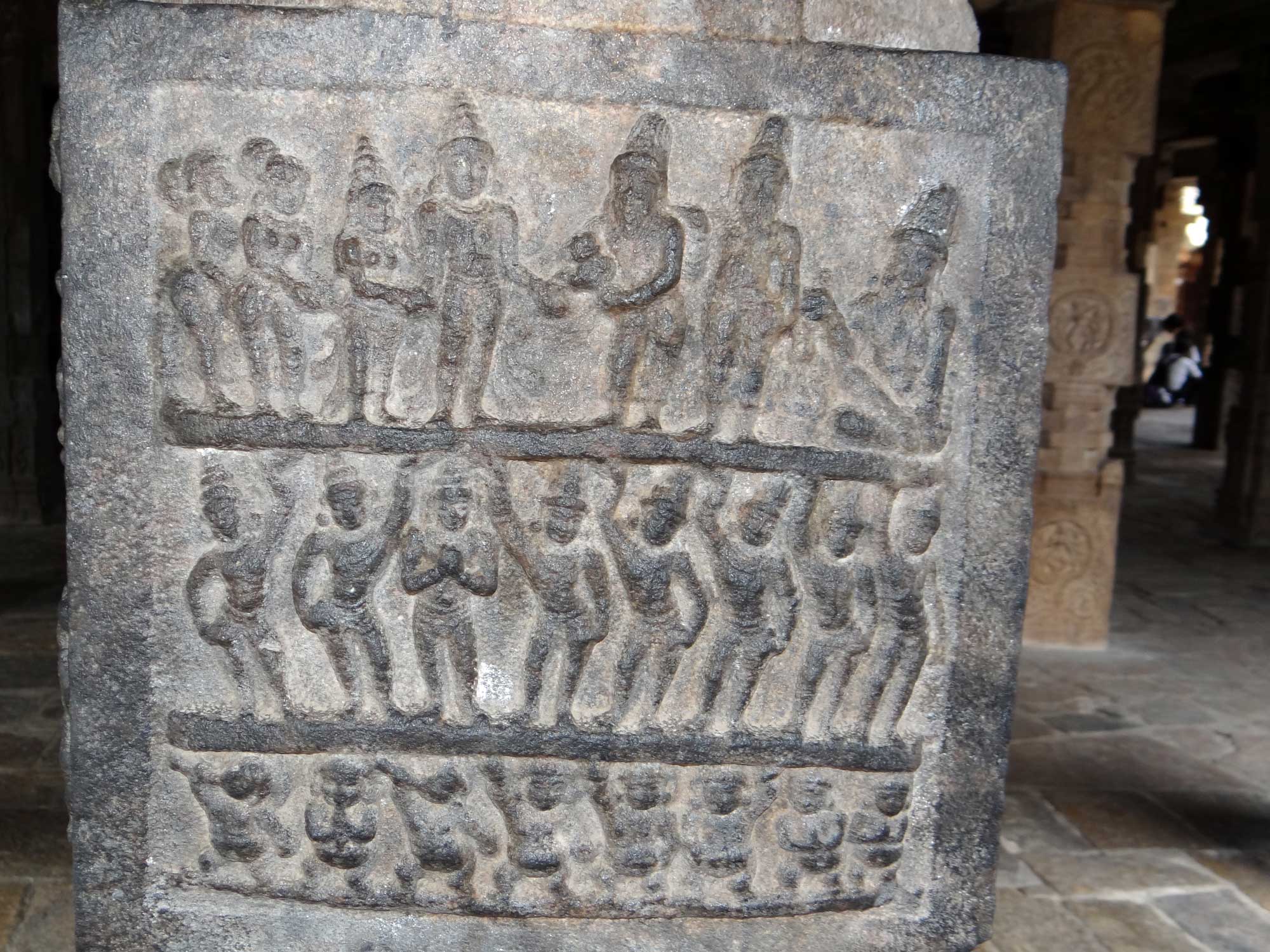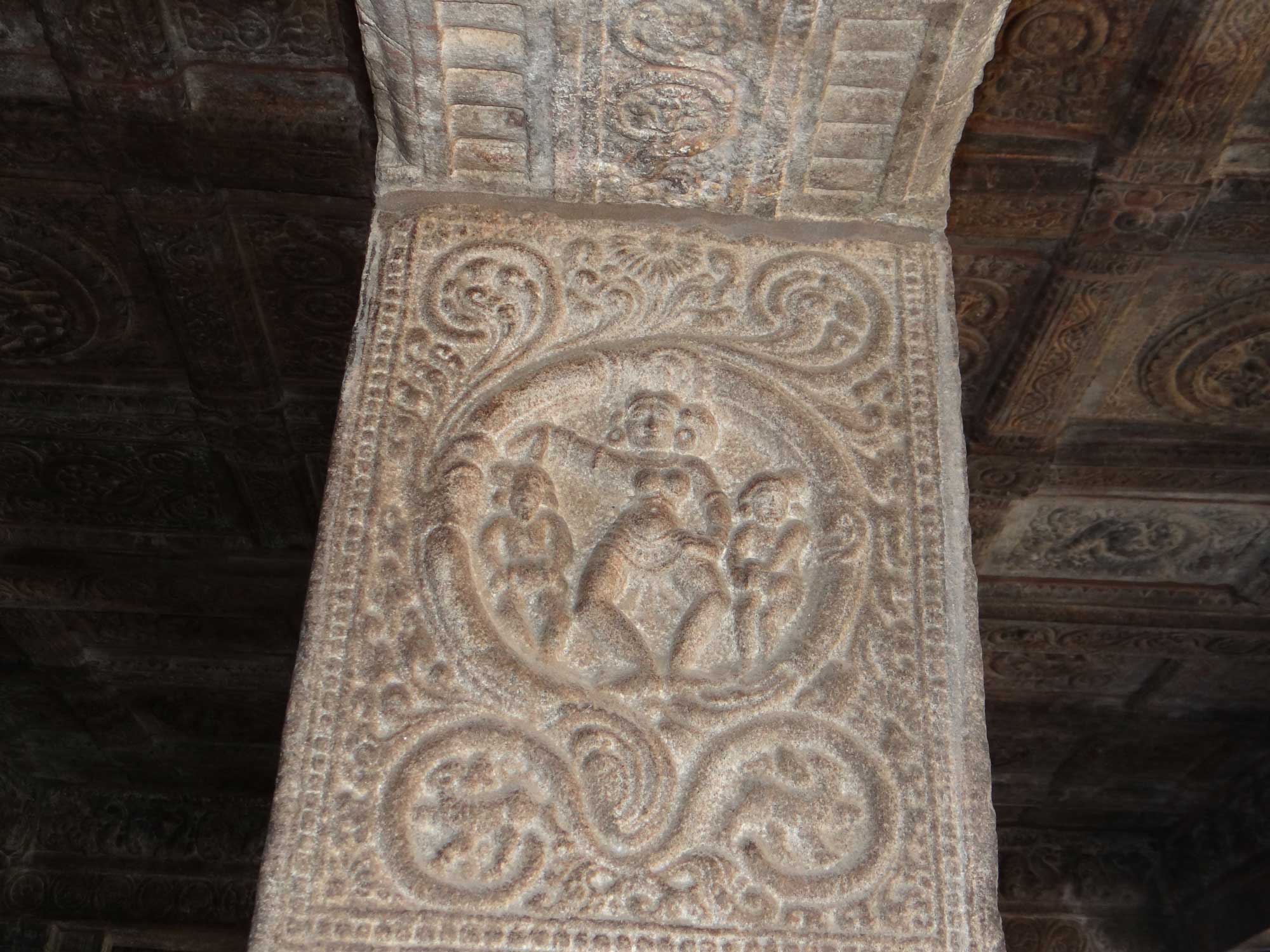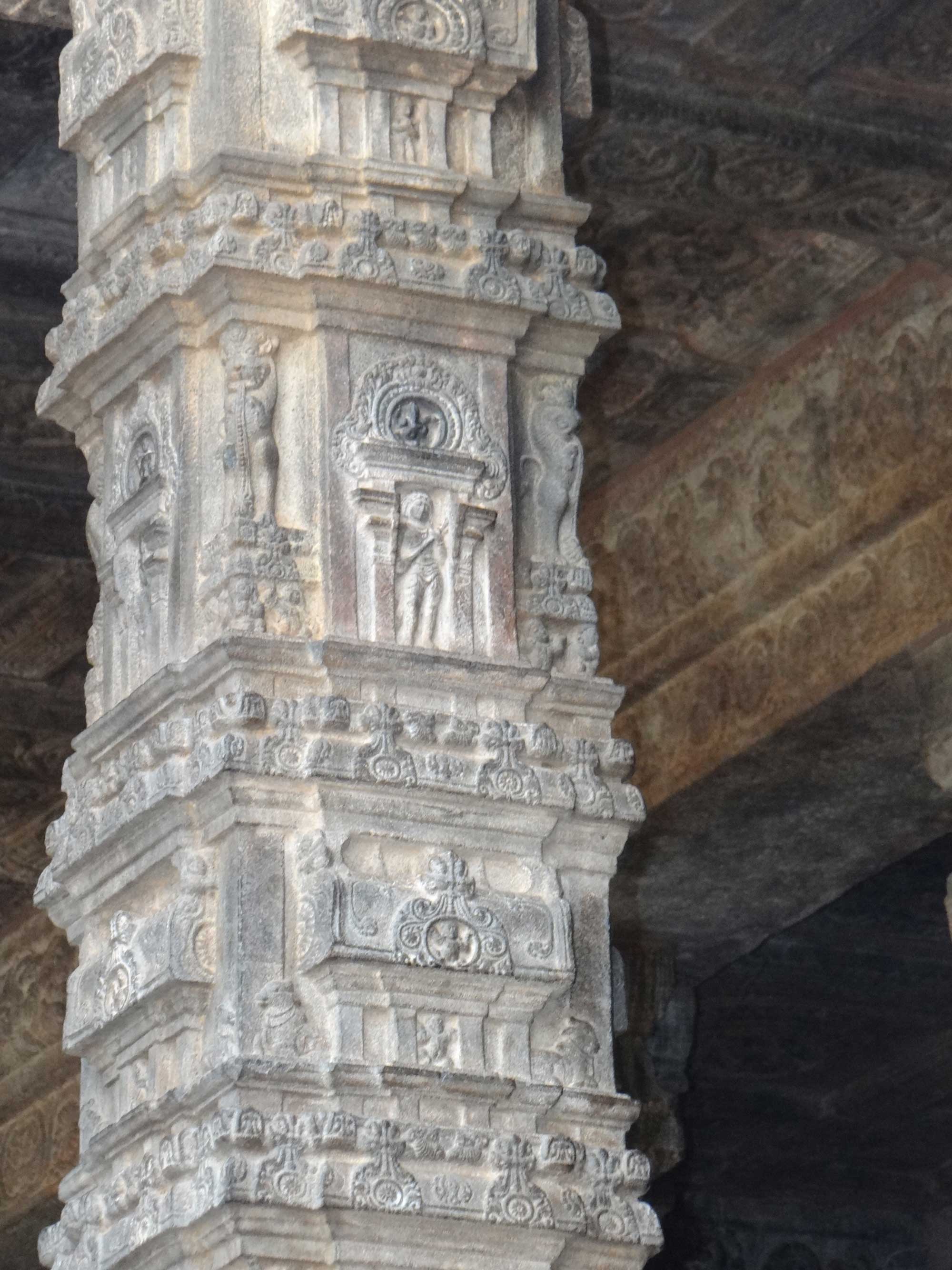 The Rajagambhira mandapam, housing the sanctum (garbagriha), presents a charming facade. It is built in the form of a chariot, complete with whels, and horses in full gallop the balustrades on both sides of the steps are in the form of elephants. Inside, intricate carvings in miniature relate stories from the various puranas. A particularly spectacular miniature shows Shiva on the Nandi, flanked by devas, while the bottom half depicts dancing girls in various poses. Other sculptures depict Shiva's wedding, the mohini avatar, and Kama(cupid) being dissolved by Shiva. The dwajastambham (flag staff), in front of the main mandapam, is shorter than the structure to which it is attached.